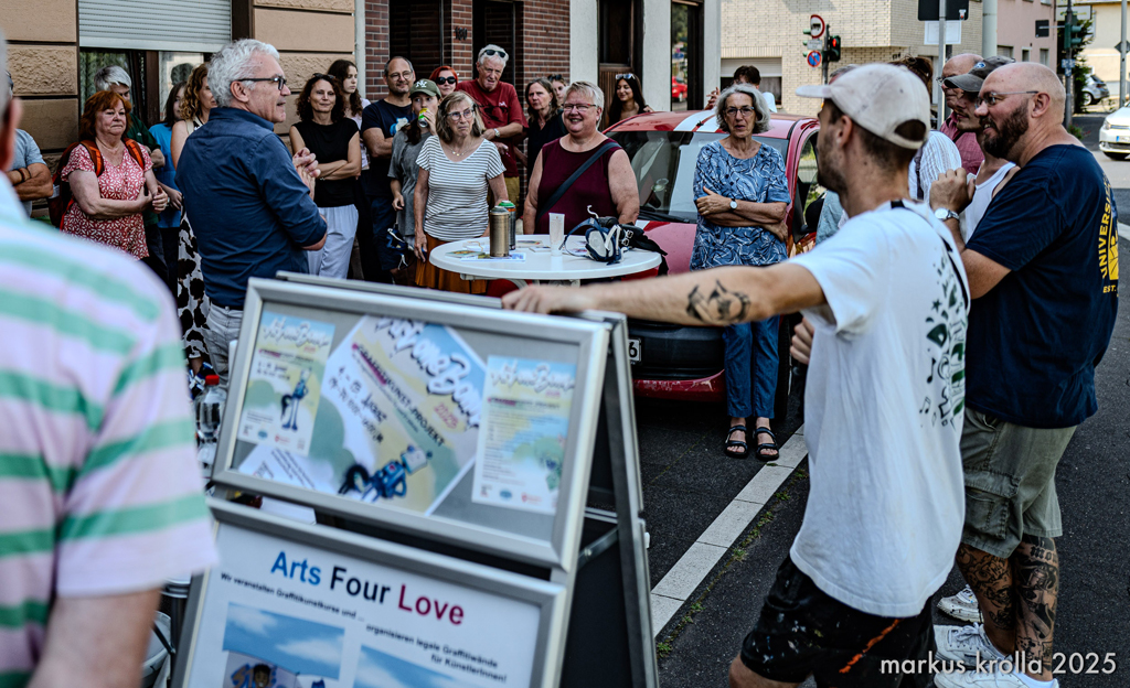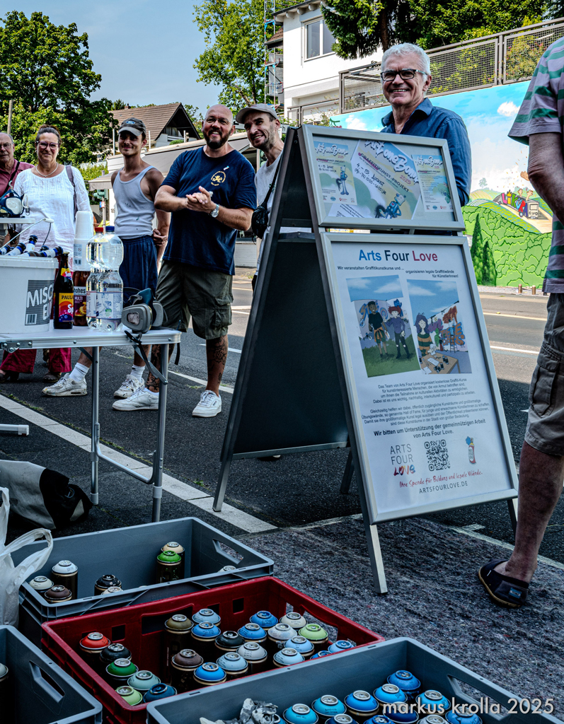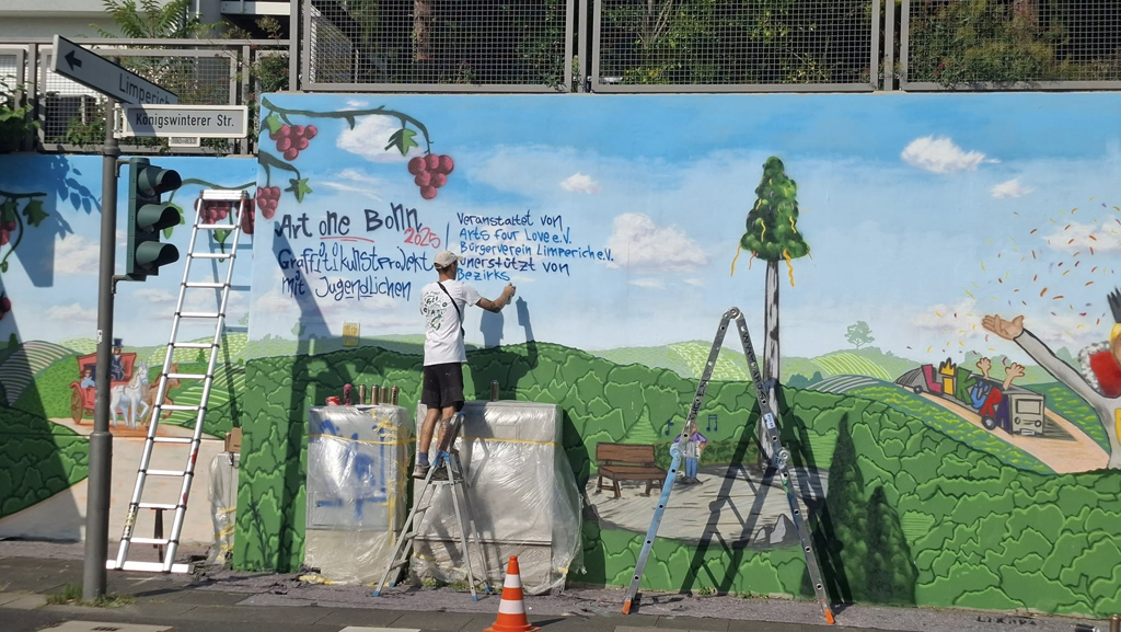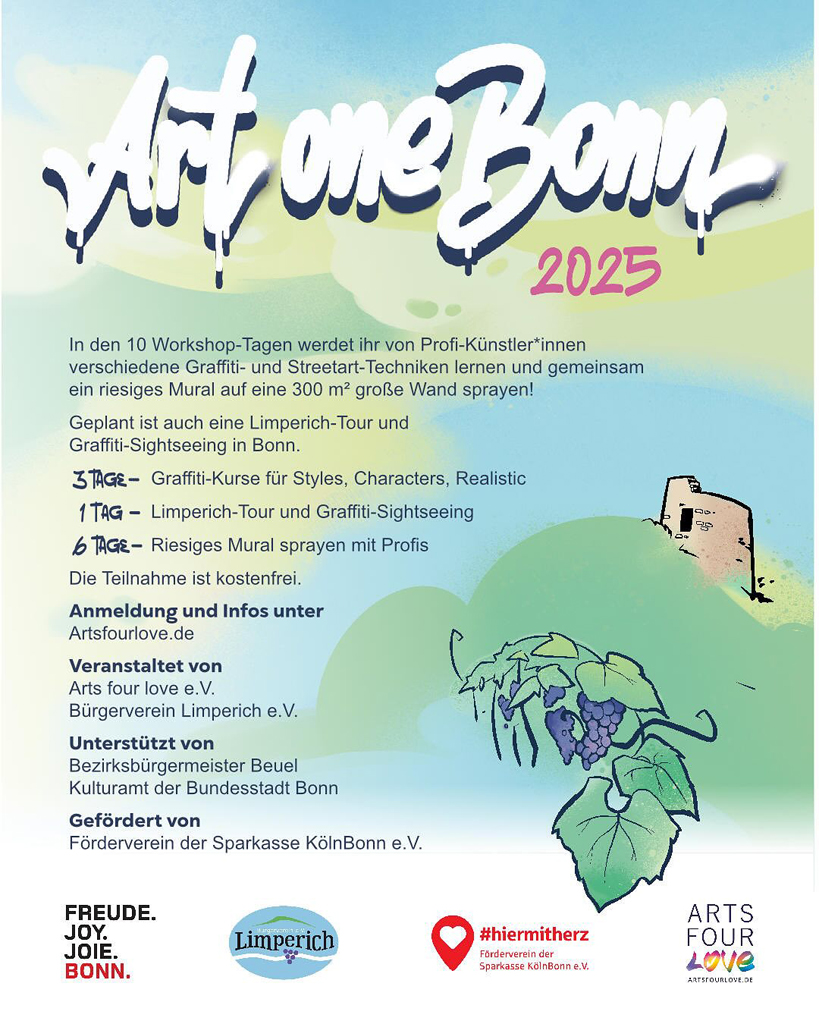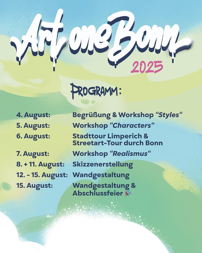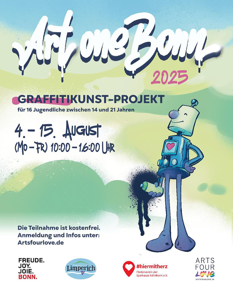 Vom 4. bis 15. August 2025 haben wir das Graffitikunst-Projekt Art One Bonn 2025 mit dem Team des Arts Four Love e.V. veranstaltet. Das Projekt wurde vom Bezirksbürgermeister Beuel Guido Pfeiffer, sowie vom Kulturamt der Bundesstadt Bonn unterstützt und vom Förderverein der Sparkasse KölnBonn e.V. gefördert.