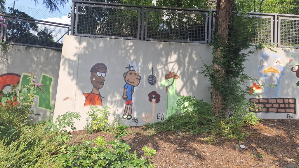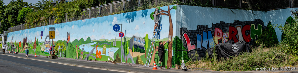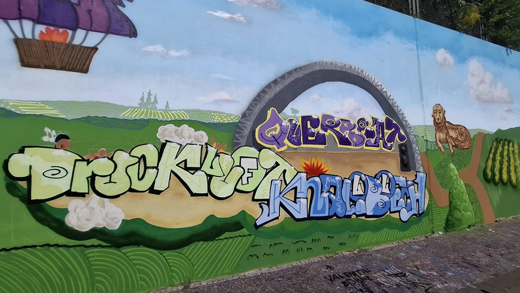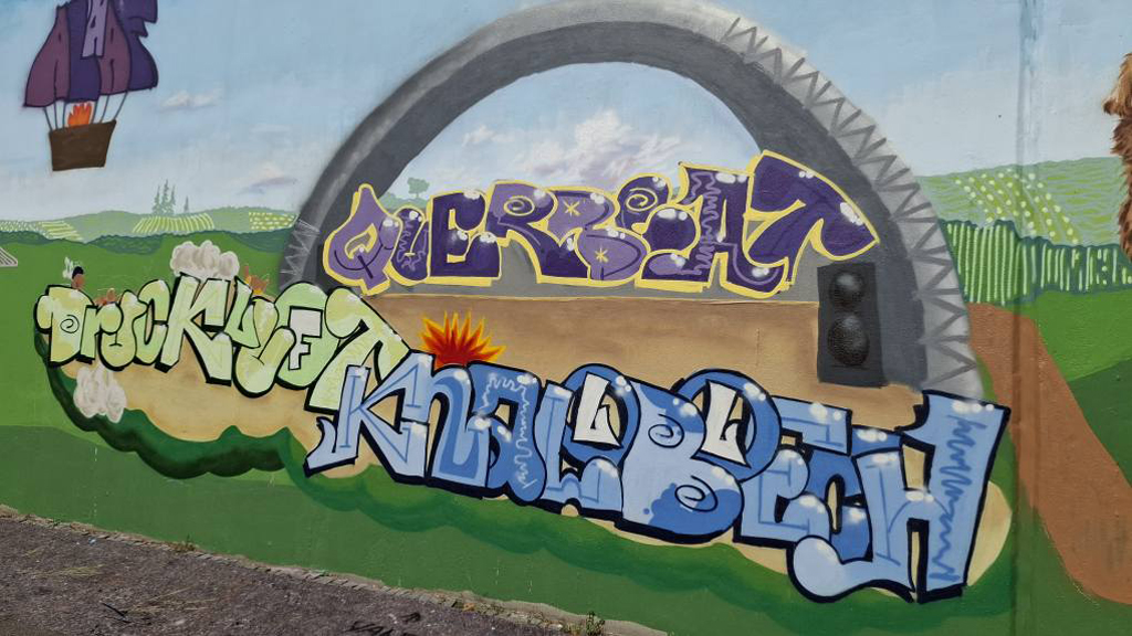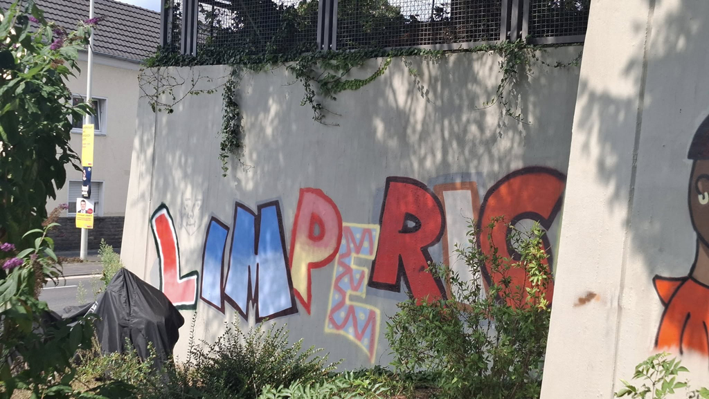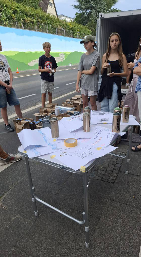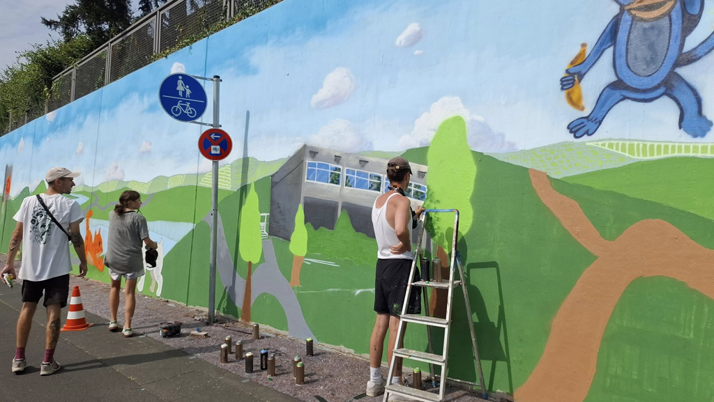 16 Bonner Jugendliche erlernten hier verschiedene Graffitikunst-Techniken und konnten ihre selbst entworfenen Bilder gemeinsam mit den Kursleiter/innen Puck.486, Milena, Kilian und Leonard als ein riesiges Mural auf die Wand sprayen. Bei einem eintägigen Exkurs erkundeten wir mit Sonja Baumgarten vom Bürgerverein Limperich den Ortsteil Limperich und sammelten in einer Graffiti-Stadttour mit Heike Larisch Inspirationen für das riesige Mural.