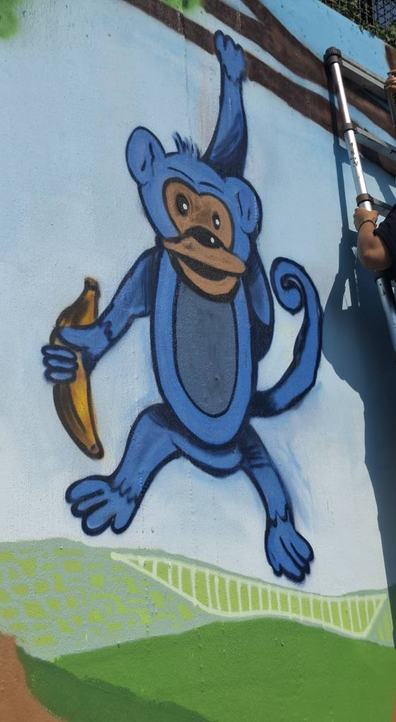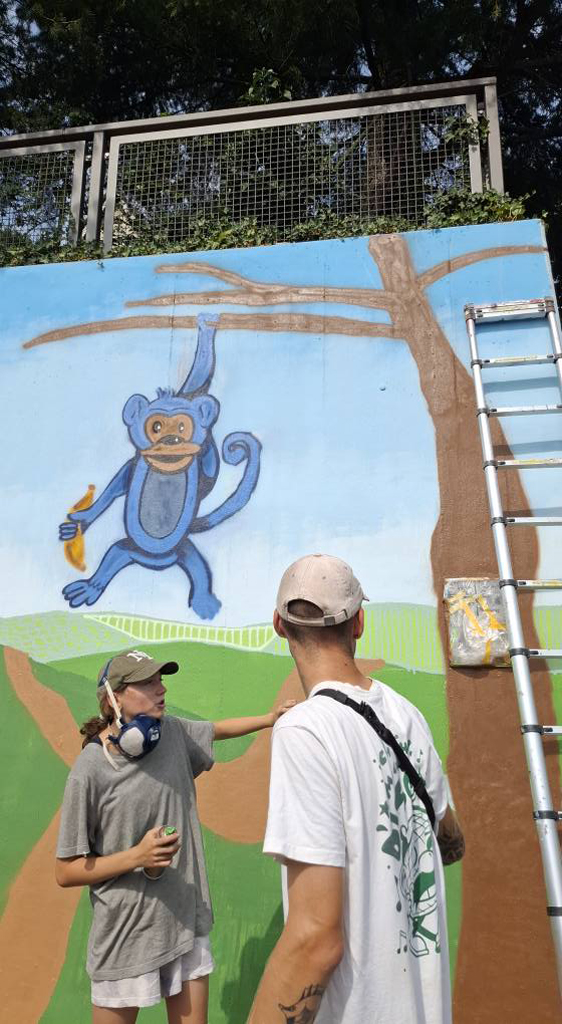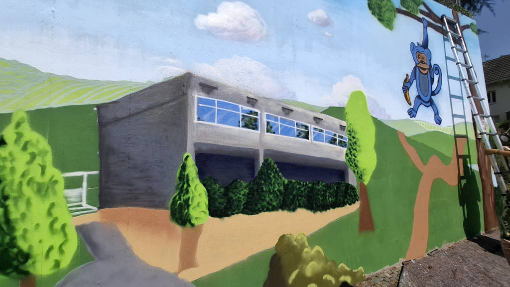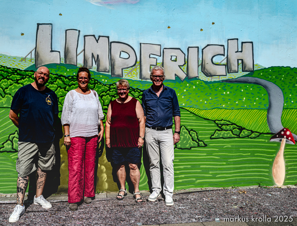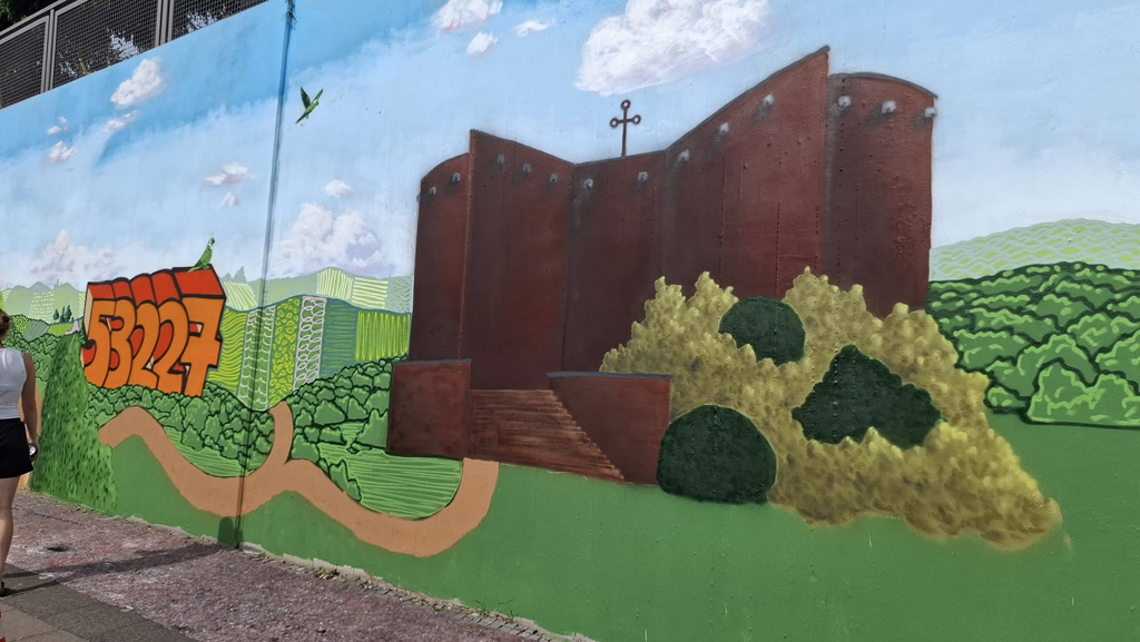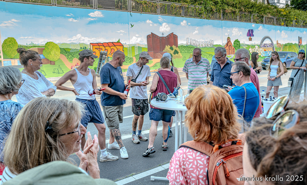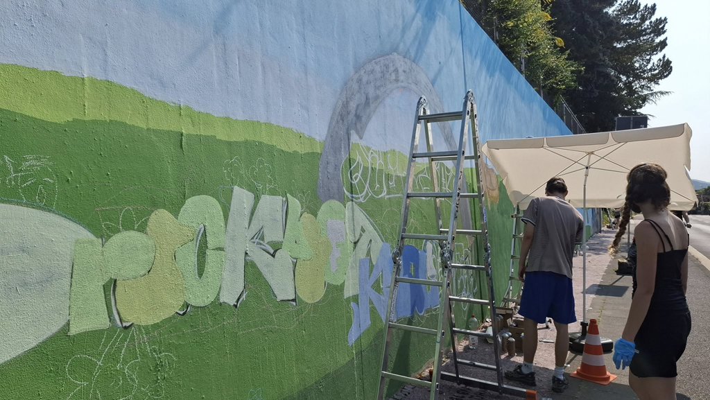 16 Bonner Jugendliche erlernten hier verschiedene Graffitikunst-Techniken und konnten ihre selbst entworfenen Bilder gemeinsam mit den Kursleiter/innen Puck.486, Milena, Kilian und Leonard als ein riesiges Mural auf die Wand sprayen. Bei einem eintägigen Exkurs erkundeten wir mit Sonja Baumgarten vom Bürgerverein Limperich den Ortsteil Limperich und sammelten in einer Graffiti-Stadttour mit Heike Larisch Inspirationen für das riesige Mural.