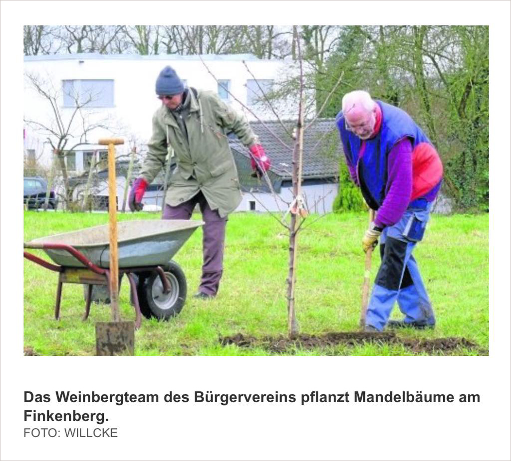 LIMPERICH. Am sonnenverwöhnten Westhang des Finkenbergs gedeihen seit Jahren besondere Pflanzen – zum Beispiel der Blaustern, die früher witterungsbedingt in dieser Region nicht zu finden war. Das brachte Karl Wengenroth, Vorsitzender des Bürgervereins Limperich und von Beruf Gärtner, auf die Idee, am renaturierten Weinberg Bäume anzupflanzen, die in südlicheren Weinanbaugebieten heimisch sind. „Wir haben uns für Mandelbäume entschieden“, erklärte Wengenroth bei einem Ortstermin am Finkenberg.